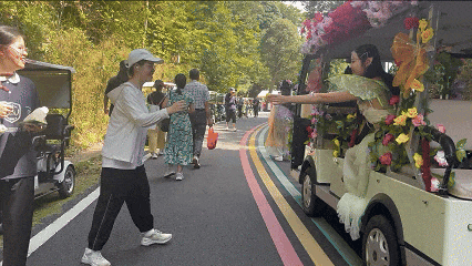 国庆恰逢中秋团圆氛围浓。中秋节当天,景区在竹林餐厅准备了一份特别的 “惊喜”—— 为前来用餐的游客免费赠送月饼。在8天小长假中,花车巡游还给游客送百香果,俘获了游客的片片欢心。