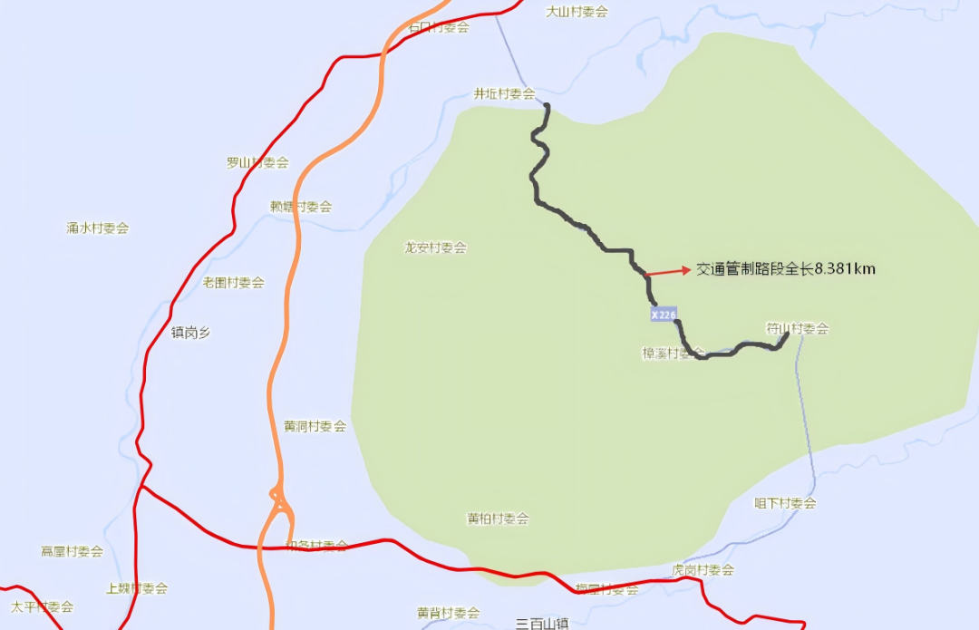交通管制区域:县道X226线K1+970—K10+351(起点:凤山乡井坵村凤栖谷交叉路口,终点:三百山镇符山村三百山景区过桥垄出口处)