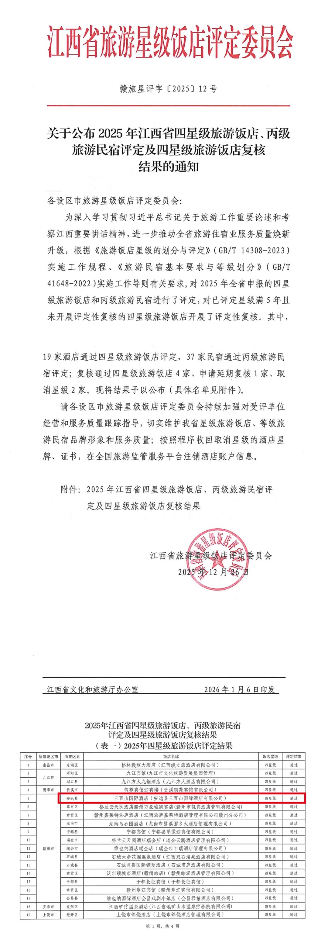 강서성 관광별급호텔 평가위원회의 『2025년 강서성 4성급 관광호텔 및 을급 관광민박 평가 및 4성급 관광호텔 재심사 결과 공지』(간여성평자[2025]12호)에 따라, 삼백산 국제호텔이 4성급 관광호텔 평가를 통과하였습니다!