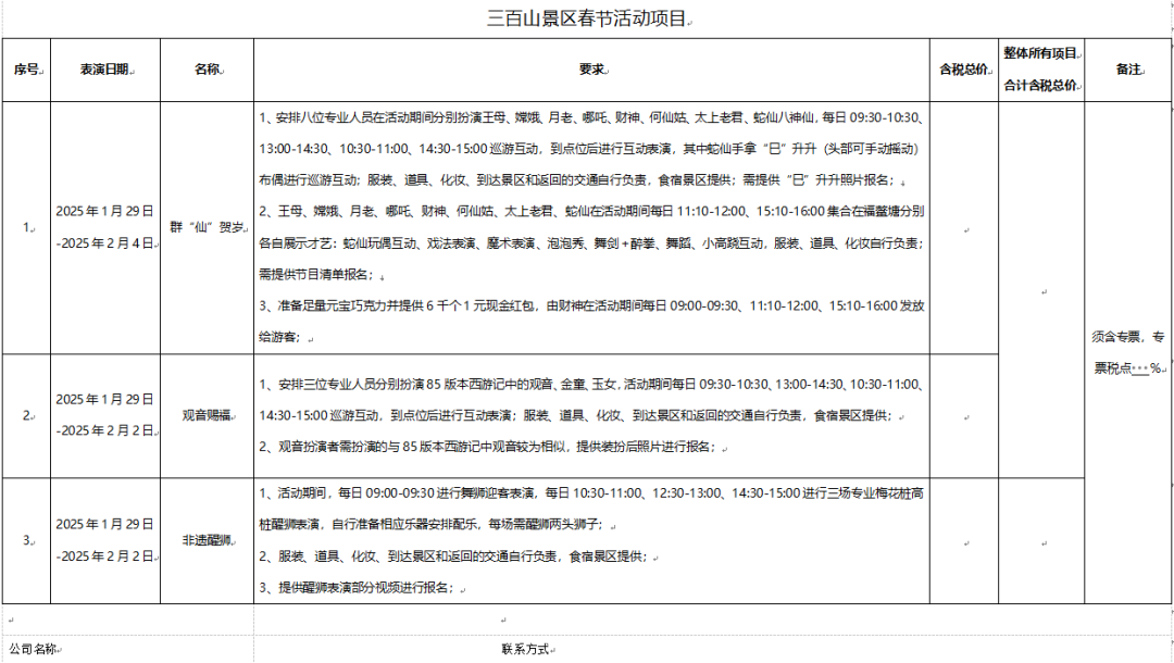询价公告: 辞旧迎新,喜迎春节。为做好三百山景区2025年春节引客引流工作,拟开展“好戏连台·火山瑶池群“仙”会”春节主题活动。以云牵雾绕的“火山瑶池”为场景,众“仙”齐聚贺新春,给与一场别开生面,热闹非凡,妙趣横生的春节体验,现需第三方承接此次春节活动,项目报名要求以公开询价方式进行招标,诚邀各公司参与报价。 1. 项目名称:三百山景区春节活动 2.项目地点:安远县三百山景区 发布公告起至2025年12月28下午18:00前发送至邮箱 1.扫描下方二维码下载报价文件,报价文件(均须加盖公章)包含询价响应书,报价清单表,营业执照复印件,经营性演艺许可证,法人身份证复印件等。 2.报价文件填写好后加盖公章,按询价文件要求发送至邮箱。 3.多家参与,择取符合活动要求及活动整体所有项目合计含税总价价优的公司,若不足三家参与报价,将以投递报价的合理性价低者选取。 (一)报价人资格要求: 1.报价人需具备《中华人民共和国政府采购法》第二十二条规定的条件; (1)具有独立承担民事责任的能力; (2)具有良好的商业信誉和健全的财务会计制度; (3)具有履行合同所必需的设备和专业技术能力; (4)有依法缴纳税收和社会保障资金的良好记录; 2.报价人须是中华人民共和国境内合法注册,能独立承担民事责任的法人; (二)验收标准: 签订合同后项目能稳定运行,经甲方确认后可进行验收。 安远县三百山景区 地址:江西省赣州市安远县三百山镇三百山景区 邮 箱:a17770720525@163.com 更多游玩攻略推荐