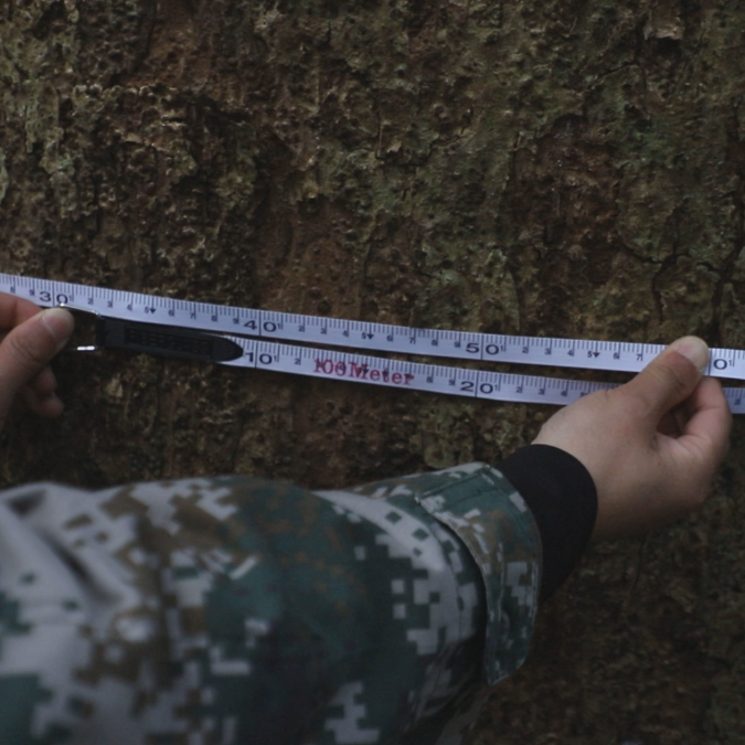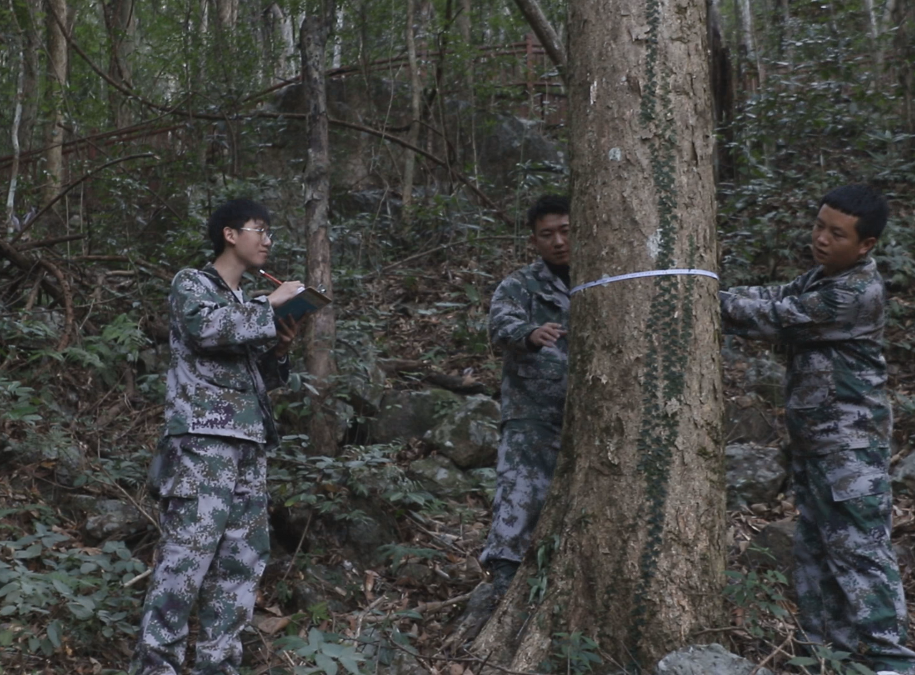 在三百山景区,国家二级重点保护野生植物楠木天然种群在此扎根生长,参天的楠木树林枝叶繁茂,树干粗壮挺拔,巡护人员正用围尺测量树干围径。此次发现的楠木种群涵盖不同生长阶段,其中围径超一米的成年楠木约40-60株,并且有多个不同品种,与周边植被形成完整的生态群落,对研究亚热带森林生态系统演化具有重要意义。