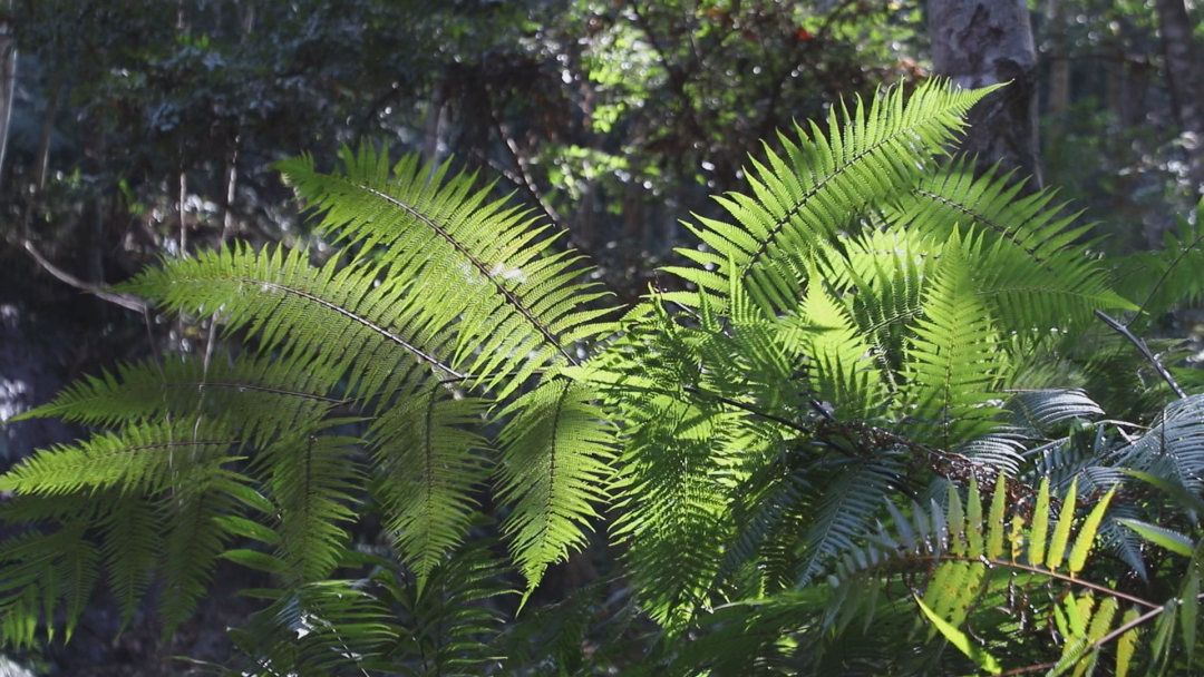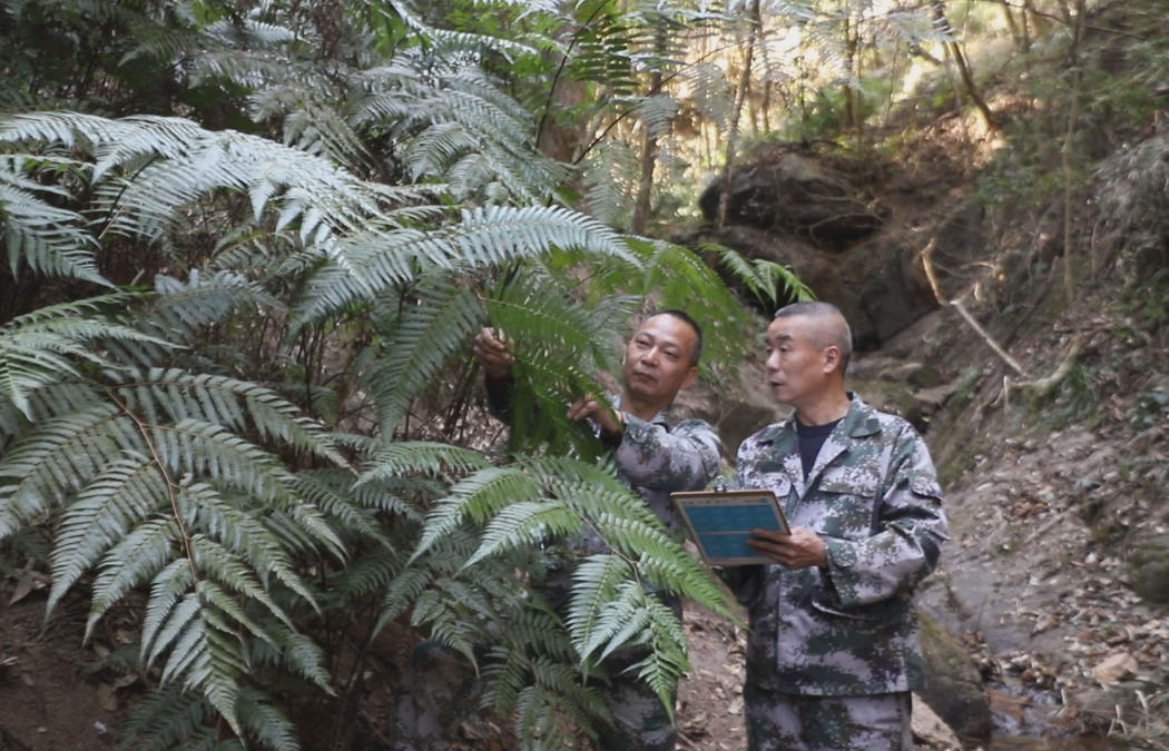 在孔田林场新塘工区的山林间,成片的金毛狗蕨沿沟谷呈块状分布,金黄的根茎绒毛在晨光中格外亮眼,叶片层层叠叠遮蔽地面。巡护人员一边清理植株周边杂灌,一边测量根茎,记录生长数据。