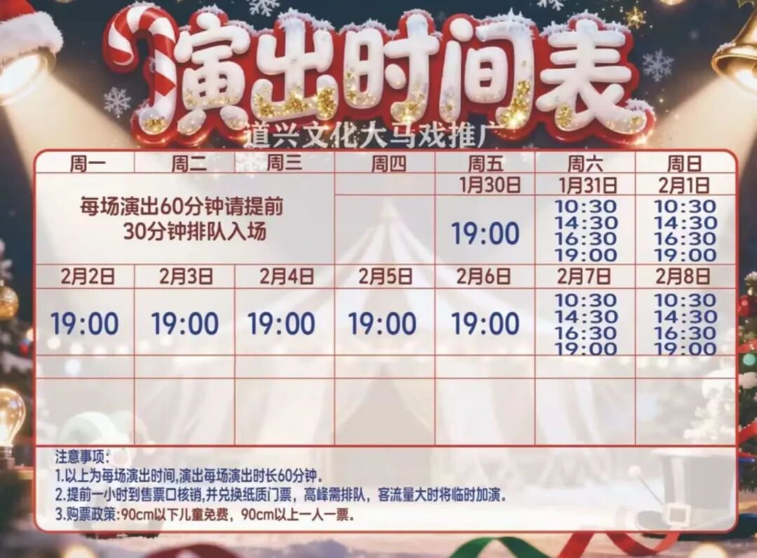 马戏演出时间:1月30日—2月8日(每天有场次,首场1月30日晚7点)