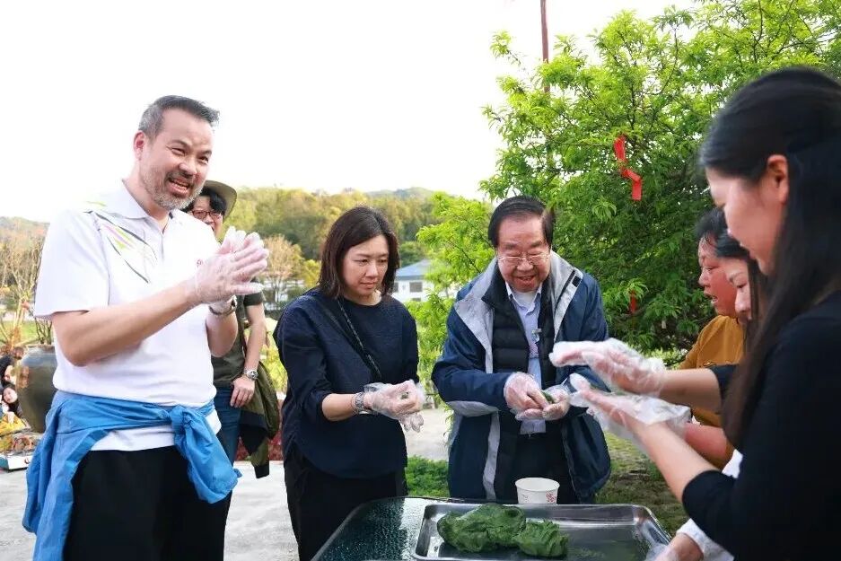 在凤山乡紫参小镇,大家深入了解乡村振兴与文旅融合发展的成果,品尝客家风味小吃,亲手体验制作艾叶粄,在互动中感受客家民俗的独特魅力。